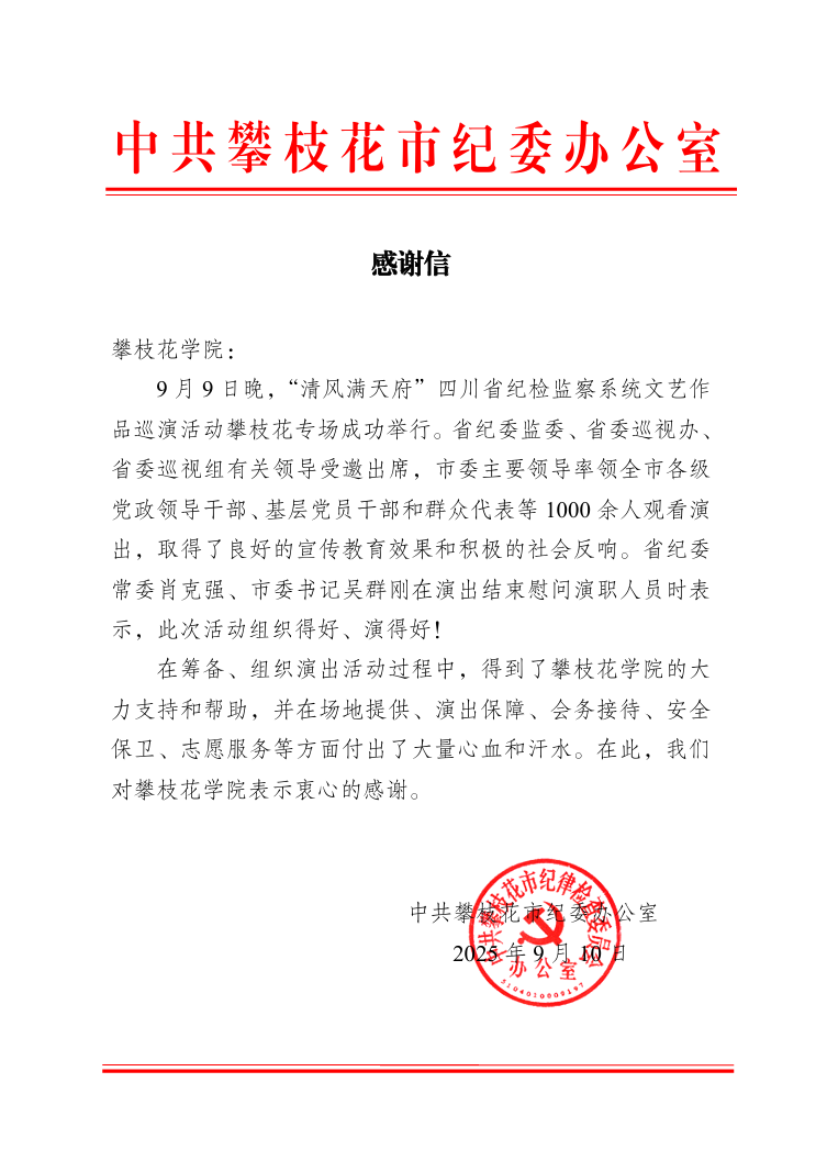 近日,学校收到来自攀枝花市纪委的感谢信,对学校在“清风满天府”四川省纪检监察系统文艺作品巡演活动攀枝花专场筹备与举办过程中所给予的大力支持表示衷心感谢。